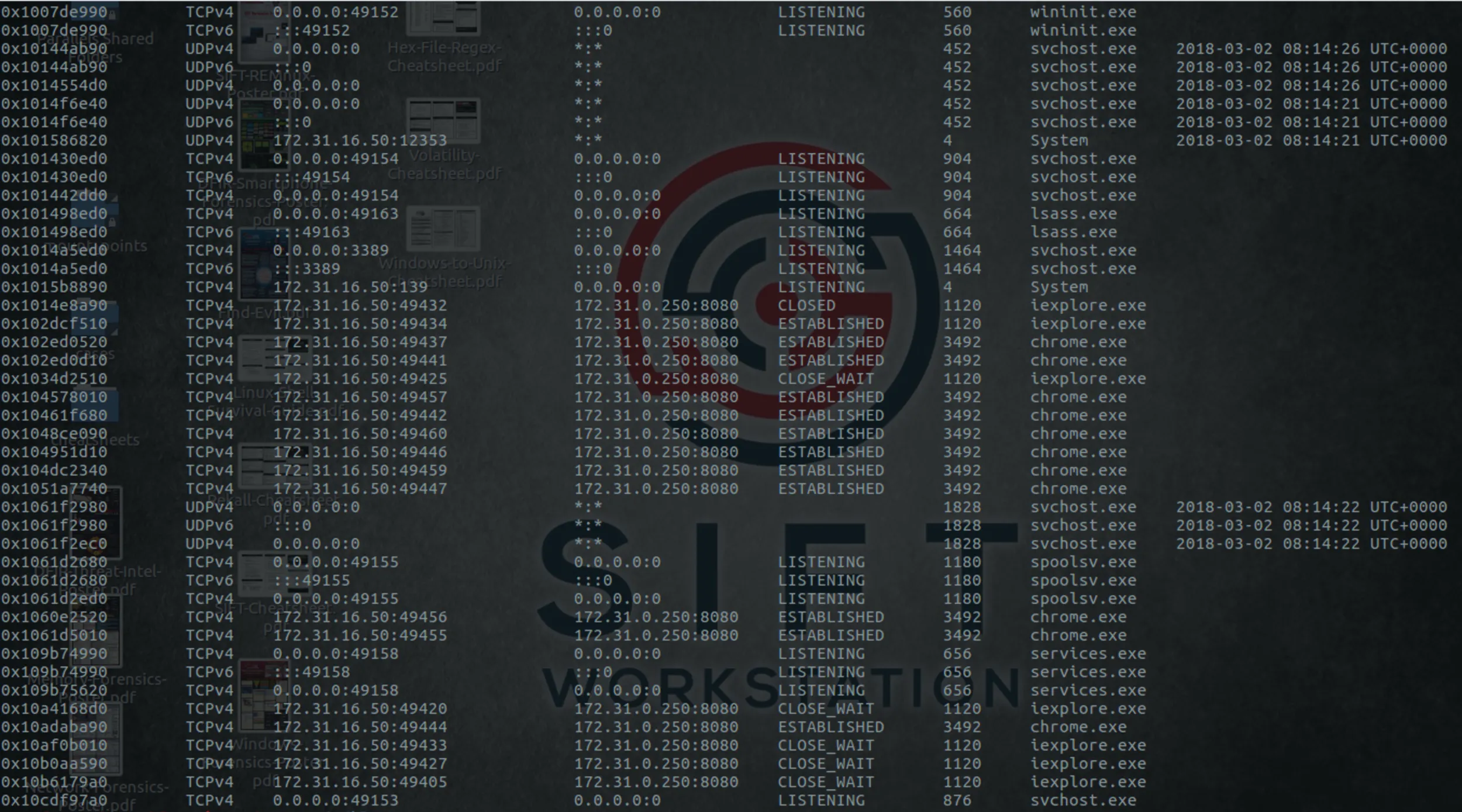 Let's have a look at how to pinpoint a particular IP address to a process using Volatility and strings. Instead of strings you could also use another utility, as long as the output contains the decimal byte offset and its corresponding string.
